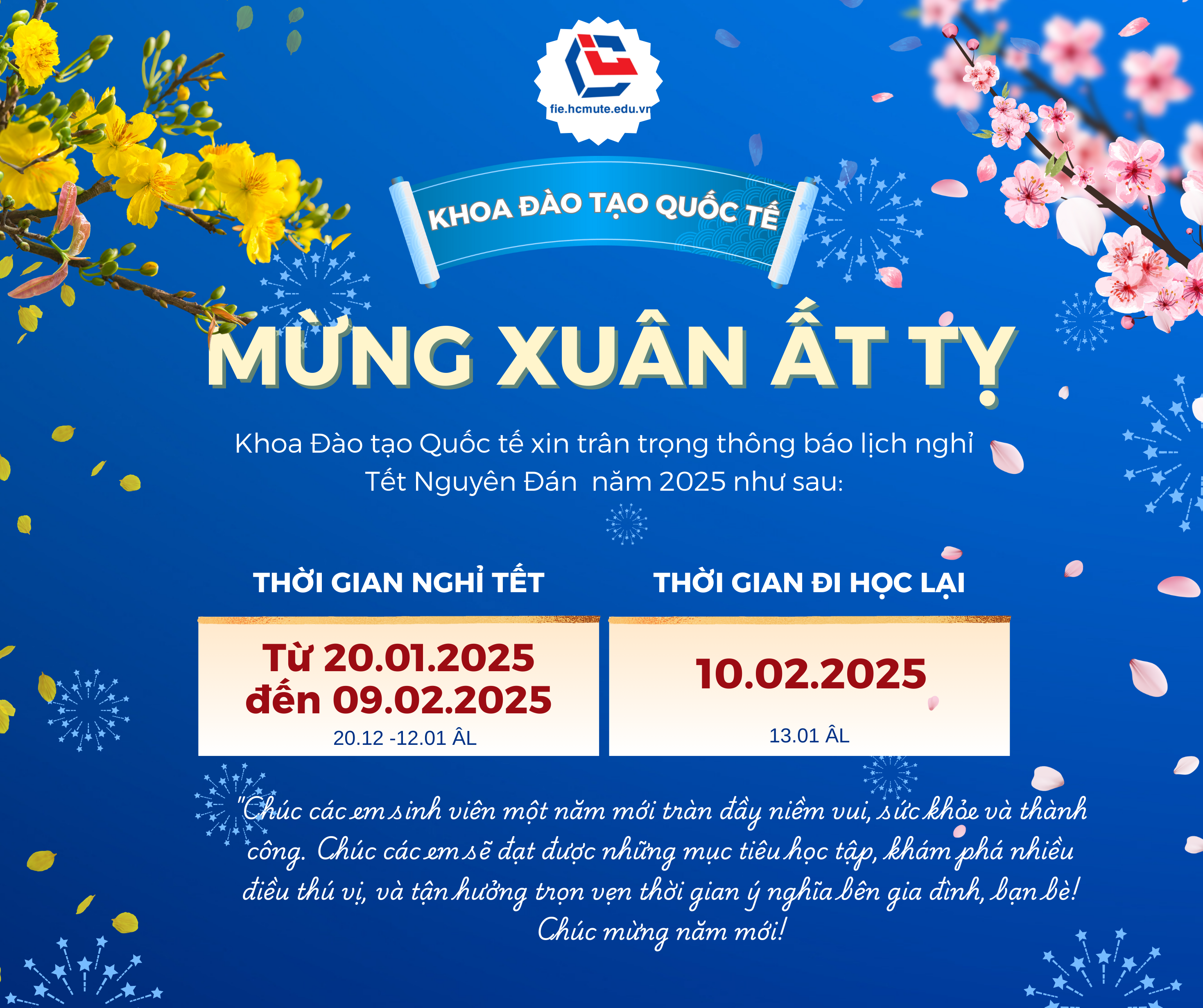 Nhân dịp xuân Ất Tỵ 2025, Khoa Đào Tạo Quốc Tế, trường Đại học Sư phạm Kỹ thuật Tp. HCM xin trân trọng thông báo lịch nghỉ Tết Nguyên Đán như sau: